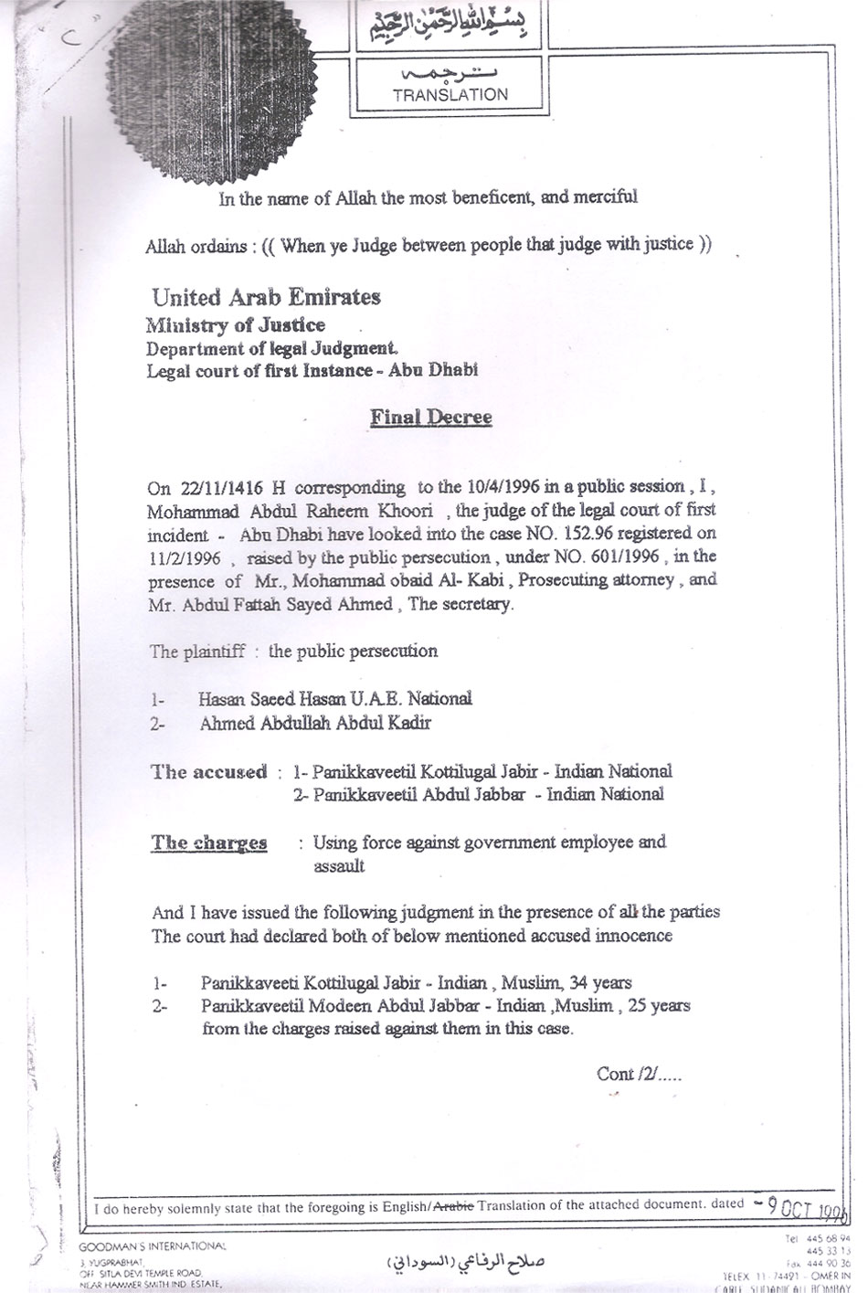 Return to Exhibits Main Case No 2557 UAE